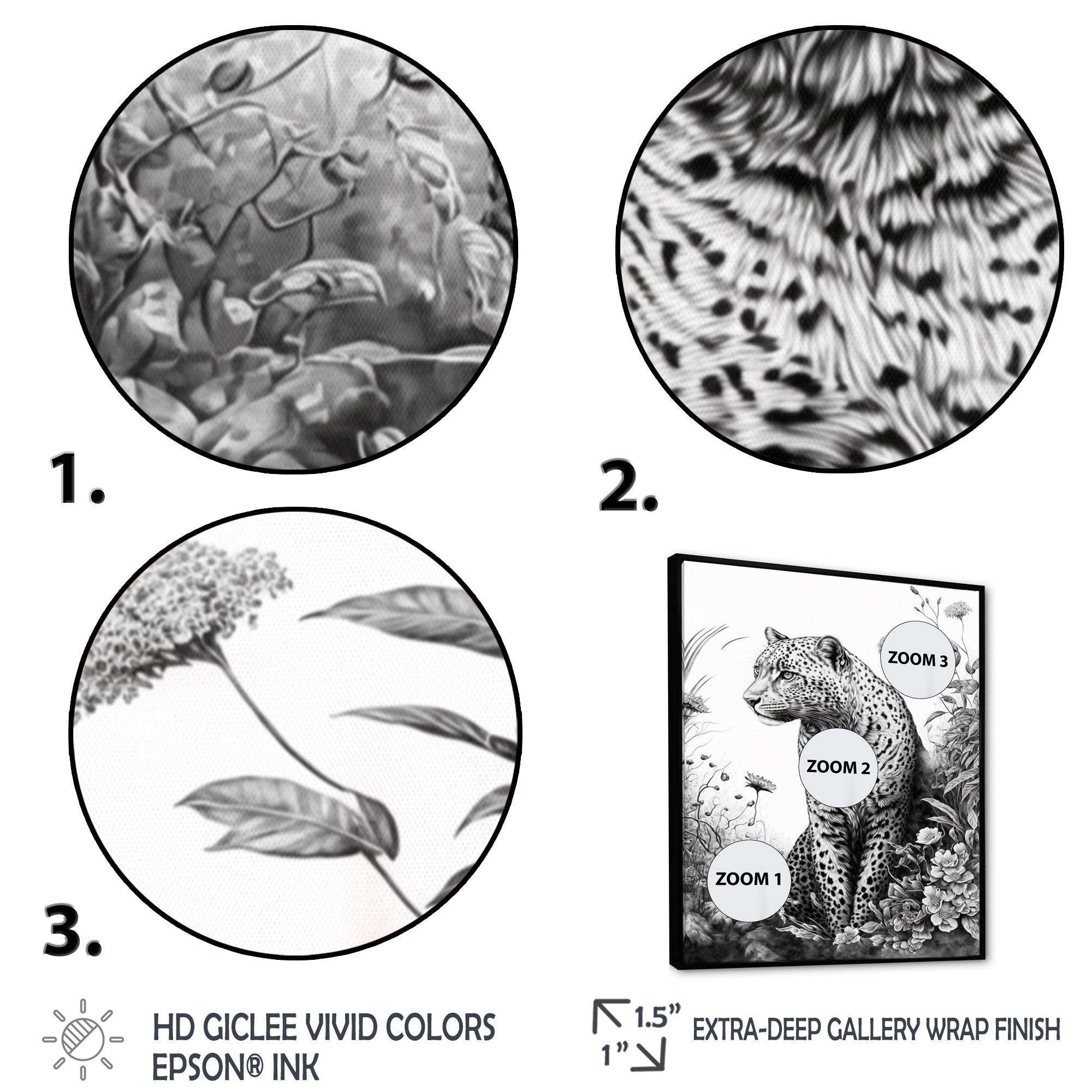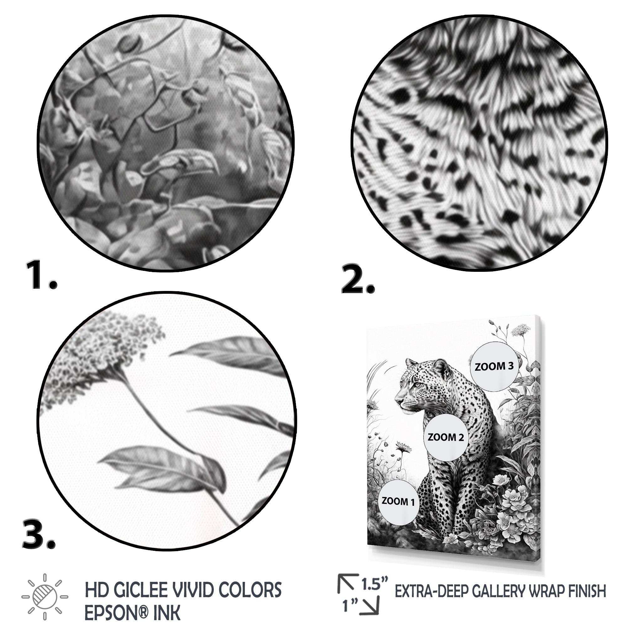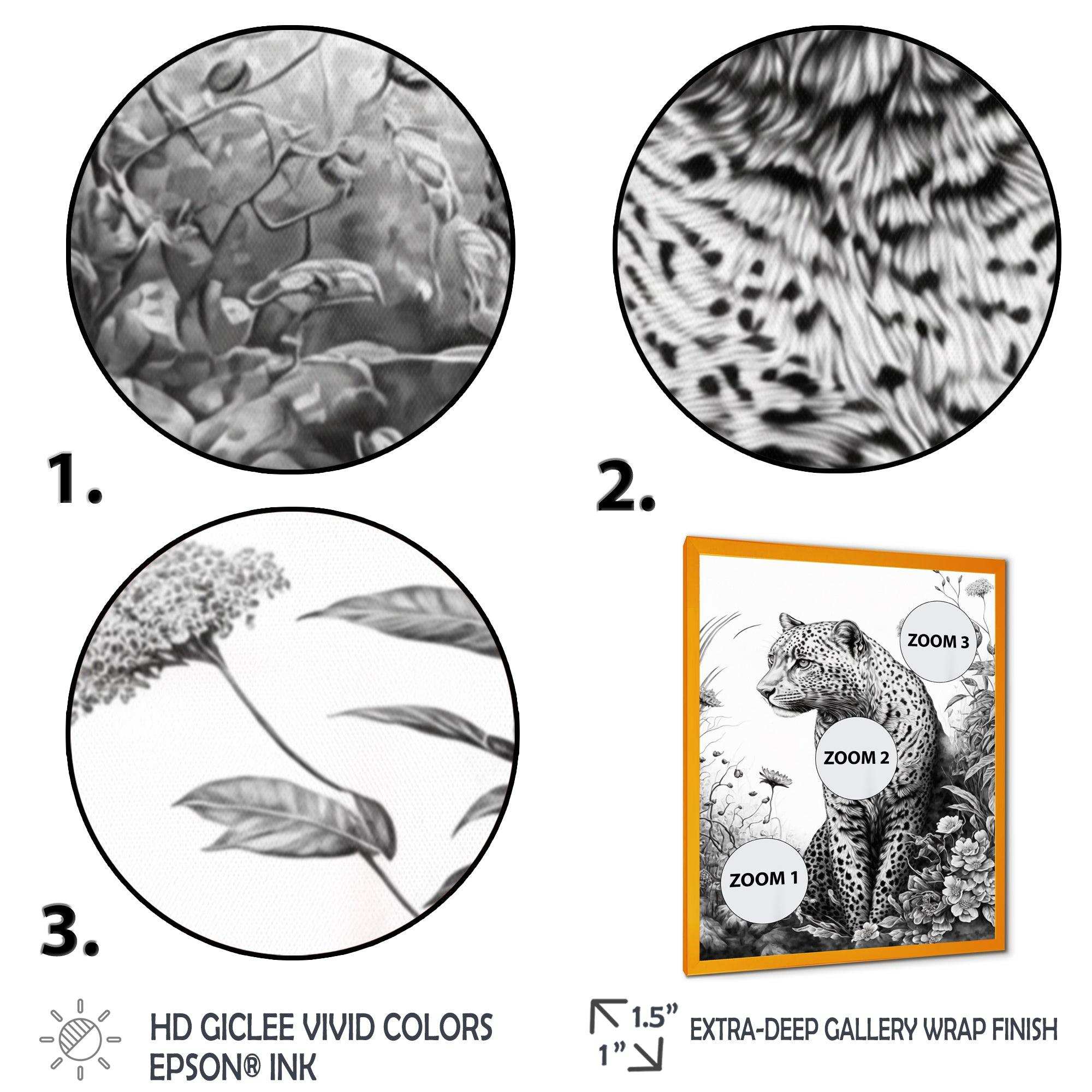 This beautiful Black And White Leopard In The Jungle Flowers I Canvas Art is printed using the highest quality fade-resistant ink on canvas. Every one of our fine art giclee canvas prints is printed on premium quality cotton canvas, using the finest quality inks which will not fade over time. Each giclee print is stretched tightly over a 1-inch wood sub frame for small size prints or a 1.5-inch wood subframe for large size prints ensuring the canvas is taught and does not buckle. This canvas art print is gallery-wrapped (the design continues on the sides), giving it a real art gallery feel. All of our canvas prints are carefully packaged with plastic protection, fragile labeling, and sturdy boxes to ensure safe delivery. Every canvas print arrives ready to hang on the wall, with the hanging kits included.