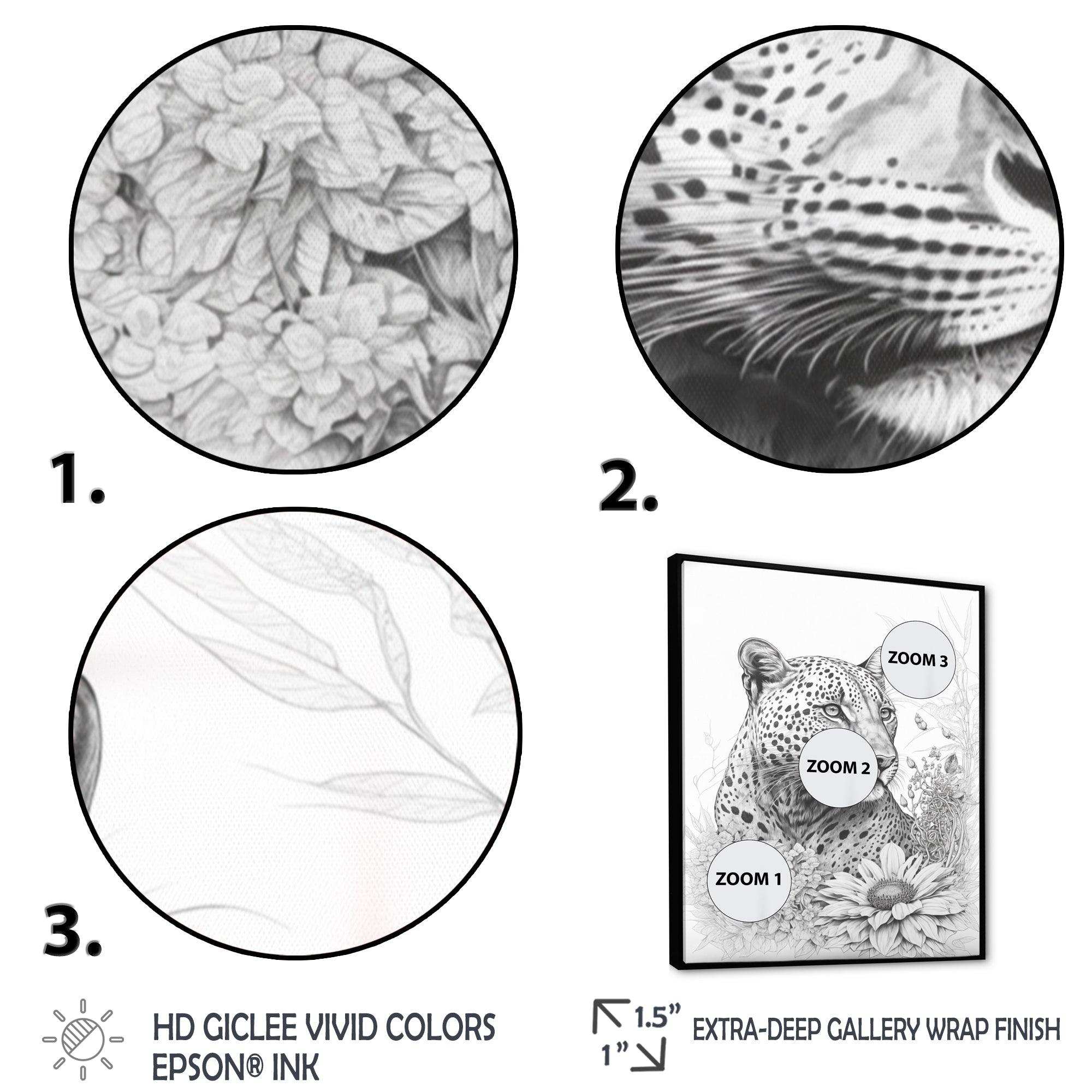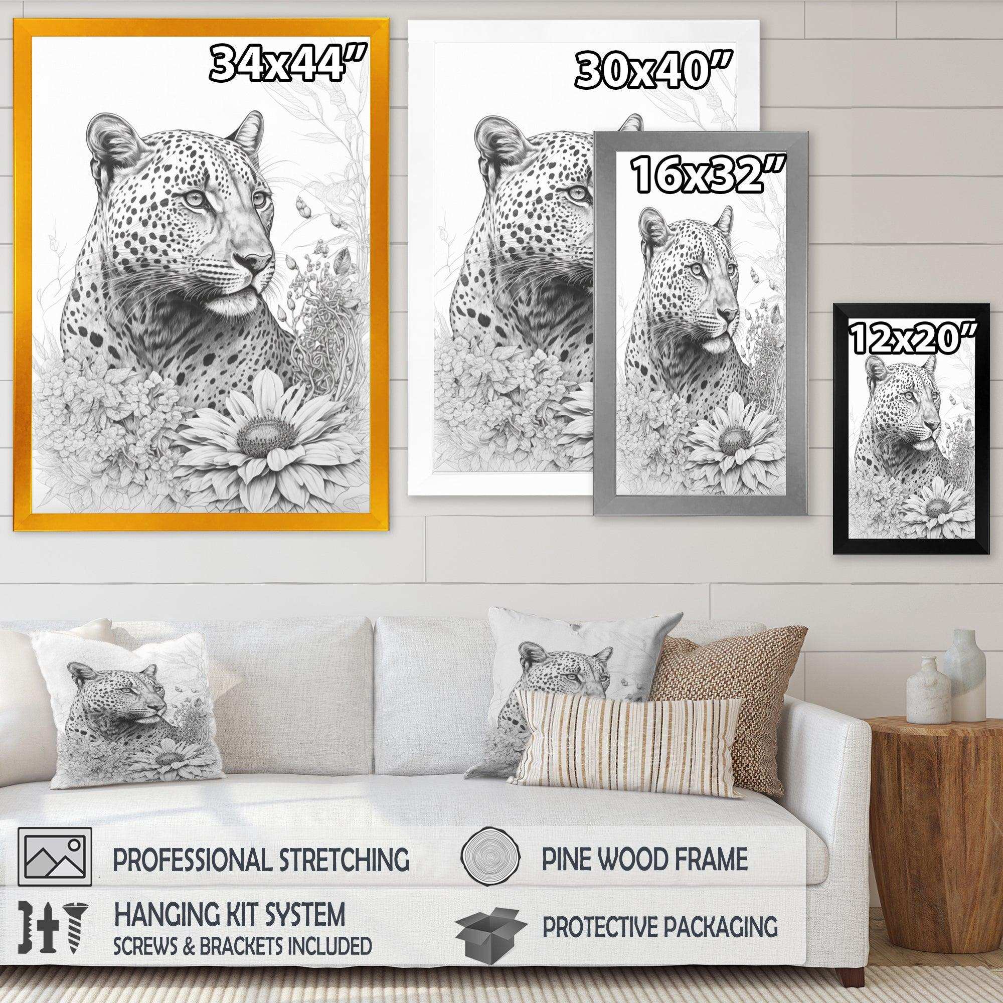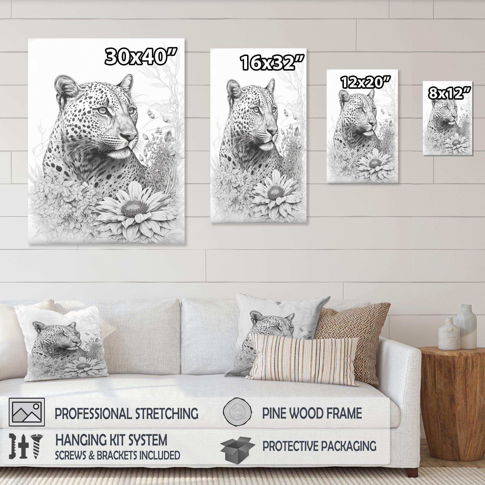 This beautiful Black And White Leopard In The Jungle Flowers II Canvas Art is printed using the highest quality fade-resistant ink on canvas. Every one of our fine art giclee canvas prints is printed on premium quality cotton canvas, using the finest quality inks which will not fade over time. Each giclee print is stretched tightly over a 1-inch wood sub frame for small size prints or a 1.5-inch wood subframe for large size prints ensuring the canvas is taught and does not buckle. This canvas art print is gallery-wrapped (the design continues on the sides), giving it a real art gallery feel. All of our canvas prints are carefully packaged with plastic protection, fragile labeling, and sturdy boxes to ensure safe delivery. Every canvas print arrives ready to hang on the wall, with the hanging kits included.