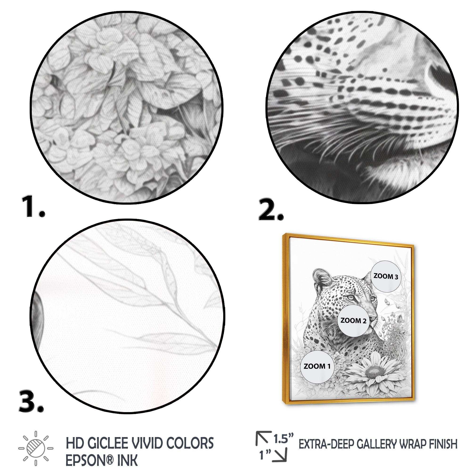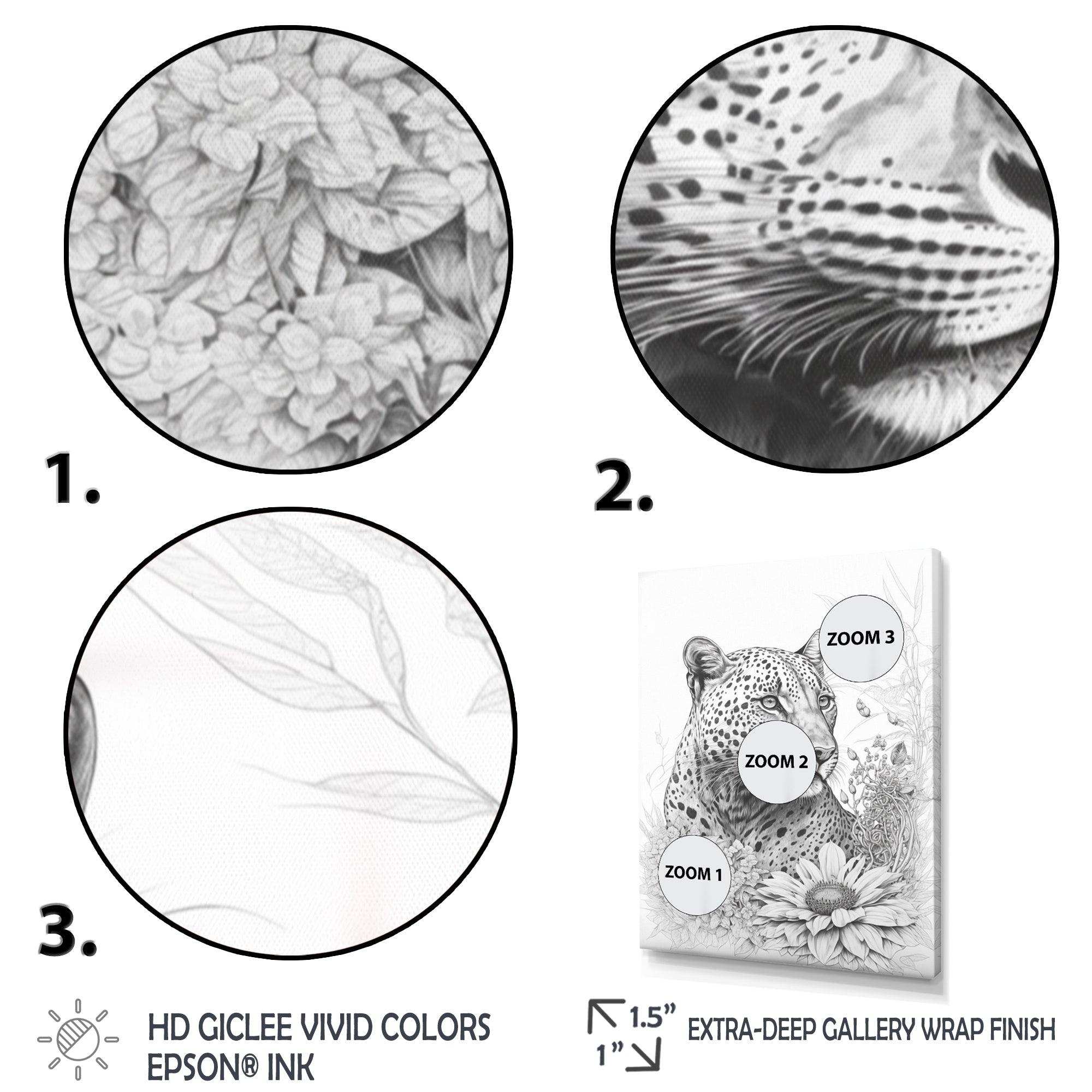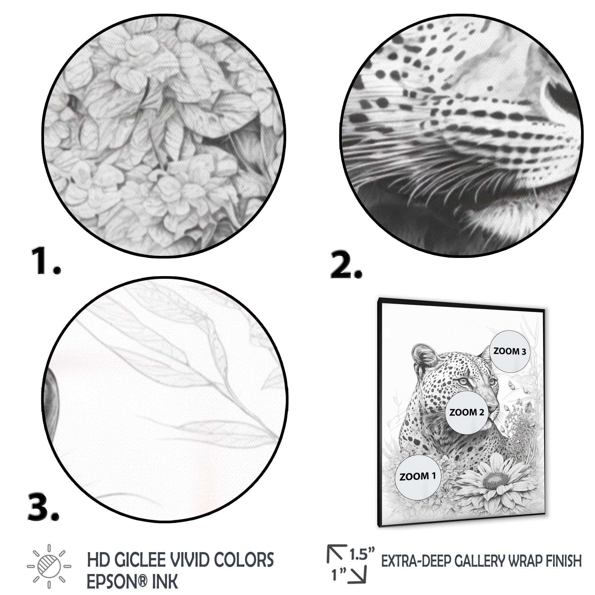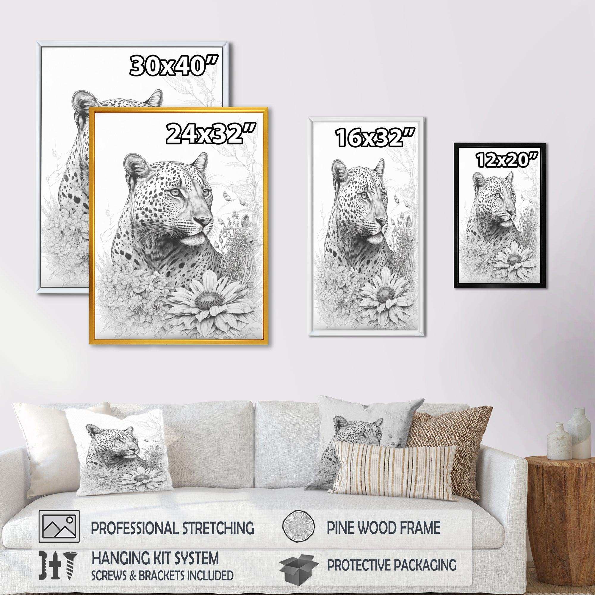 This beautiful Black And White Leopard In The Jungle Flowers II Canvas Art is printed using the highest quality fade-resistant ink on canvas. Every one of our fine art giclee canvas prints is printed on premium quality cotton canvas, using the finest quality inks which will not fade over time. Each giclee print is stretched tightly over a 1-inch wood sub frame for small size prints or a 1.5-inch wood subframe for large size prints ensuring the canvas is taught and does not buckle. This canvas art print is gallery-wrapped (the design continues on the sides), giving it a real art gallery feel. All of our canvas prints are carefully packaged with plastic protection, fragile labeling, and sturdy boxes to ensure safe delivery. Every canvas print arrives ready to hang on the wall, with the hanging kits included.