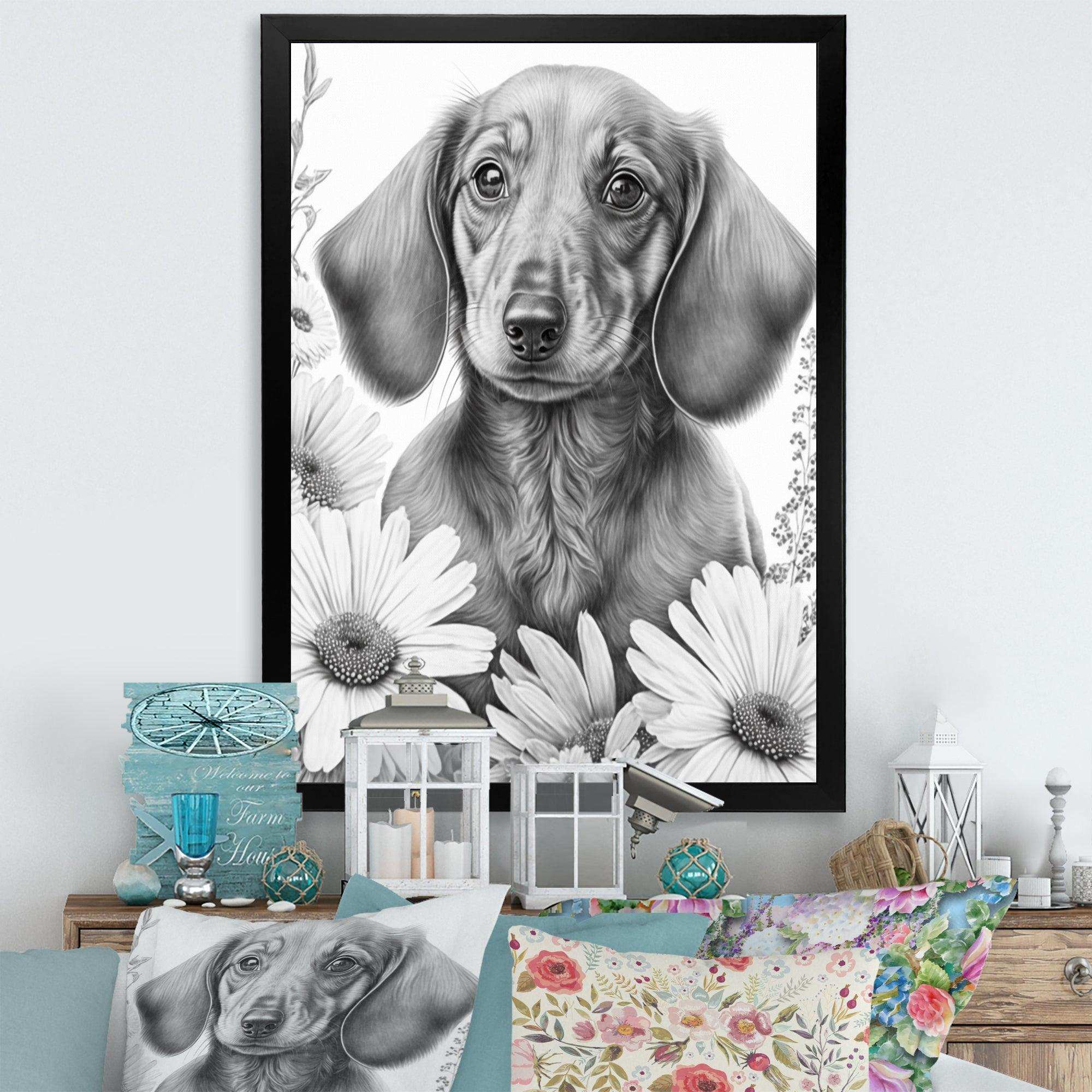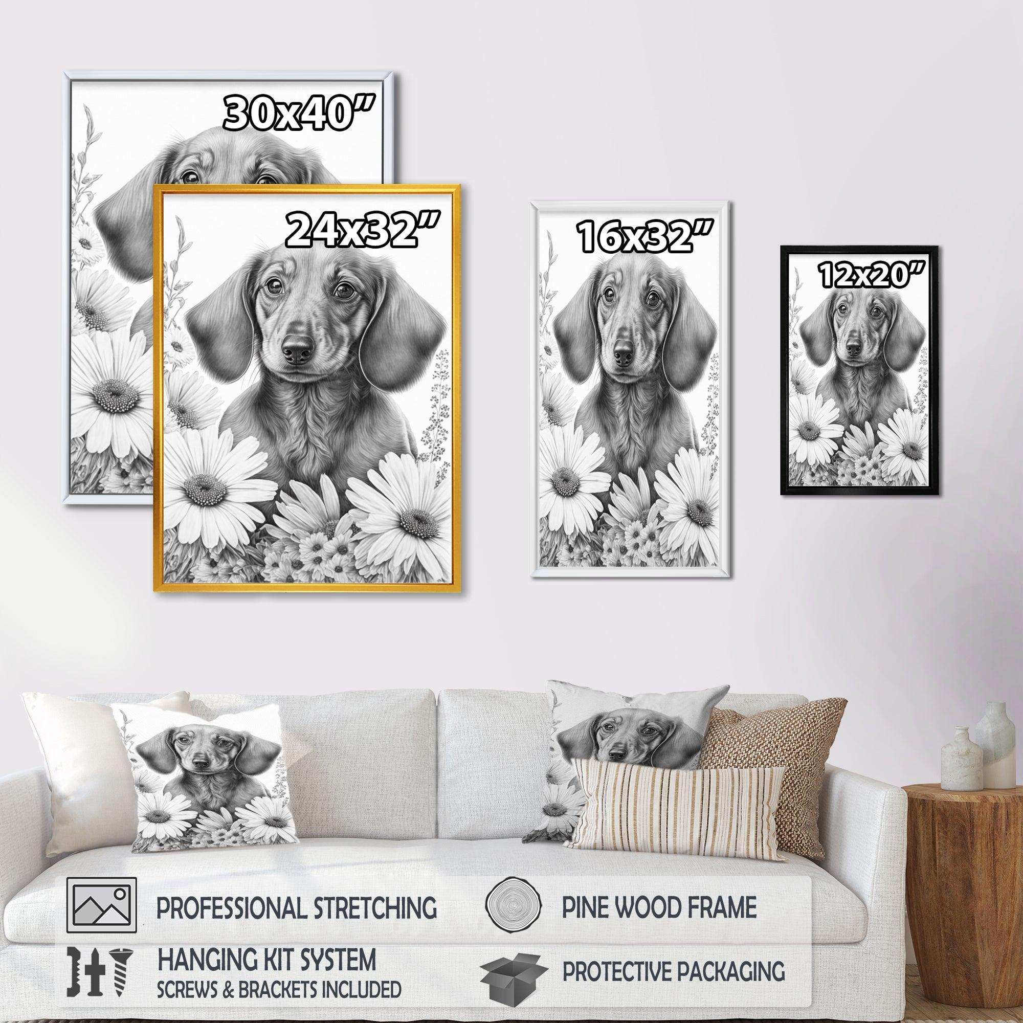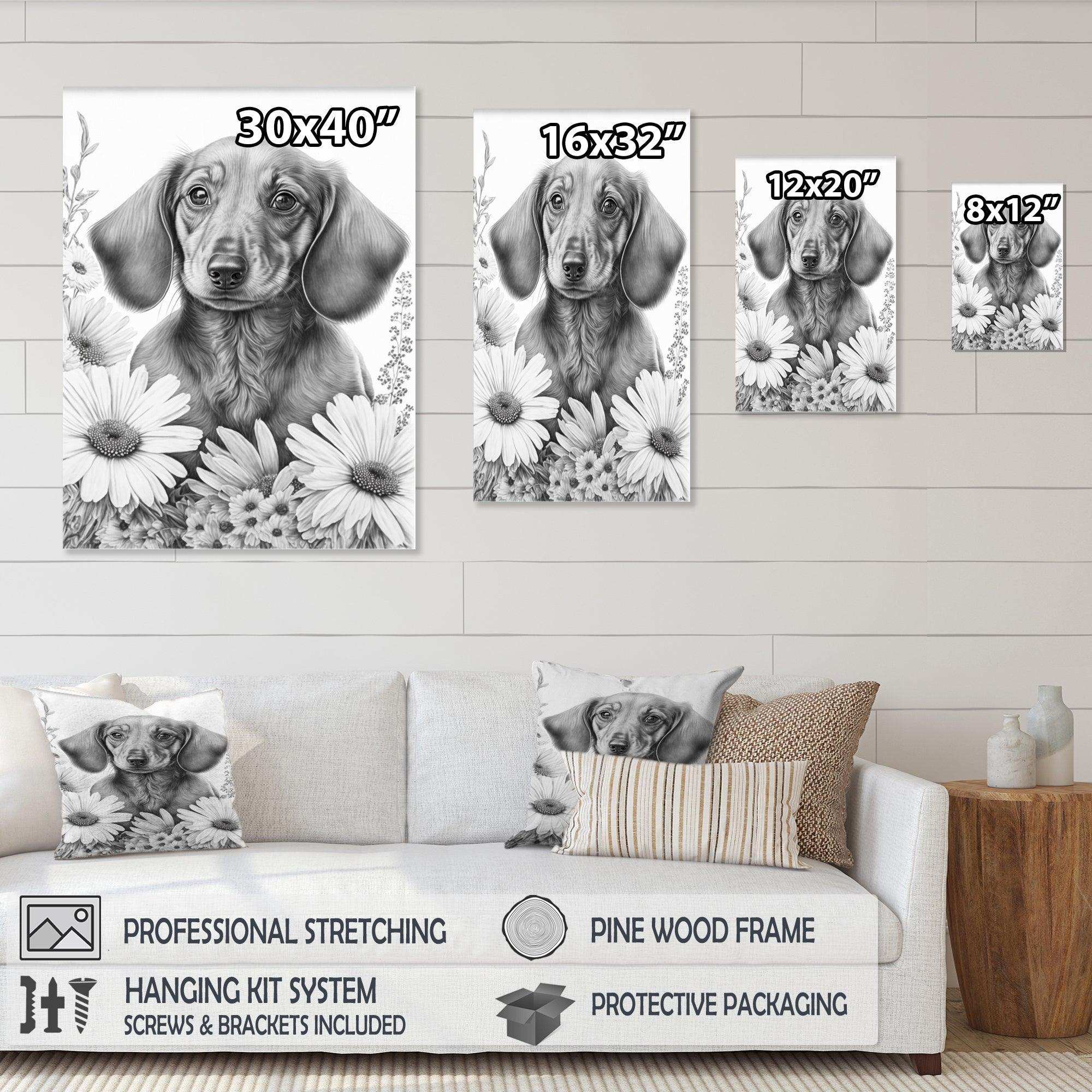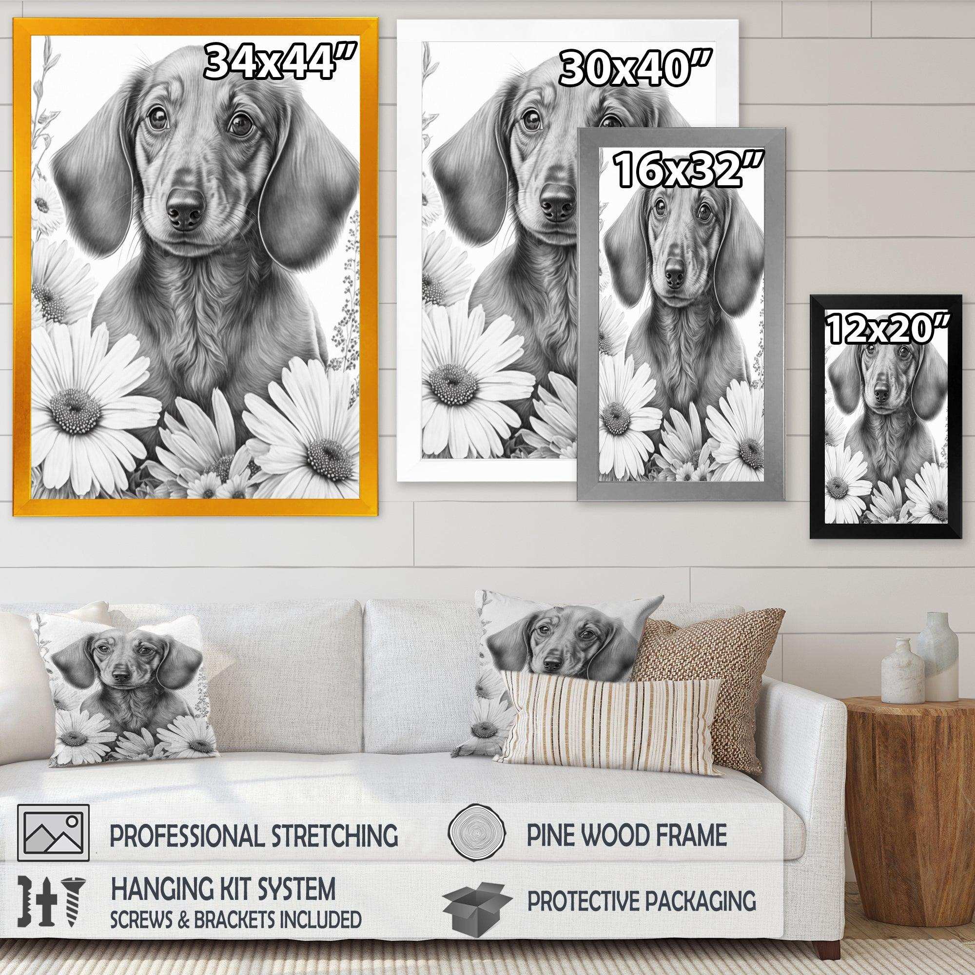 This beautiful Black Dachshund With White Flowers I Canvas Art is printed using the highest quality fade-resistant ink on canvas. Every one of our fine art giclee canvas prints is printed on premium quality cotton canvas, using the finest quality inks which will not fade over time. Each giclee print is stretched tightly over a 1-inch wood sub frame for small size prints or a 1.5-inch wood subframe for large size prints ensuring the canvas is taught and does not buckle. This canvas art print is gallery-wrapped (the design continues on the sides), giving it a real art gallery feel. All of our canvas prints are carefully packaged with plastic protection, fragile labeling, and sturdy boxes to ensure safe delivery. Every canvas print arrives ready to hang on the wall, with the hanging kits included.
