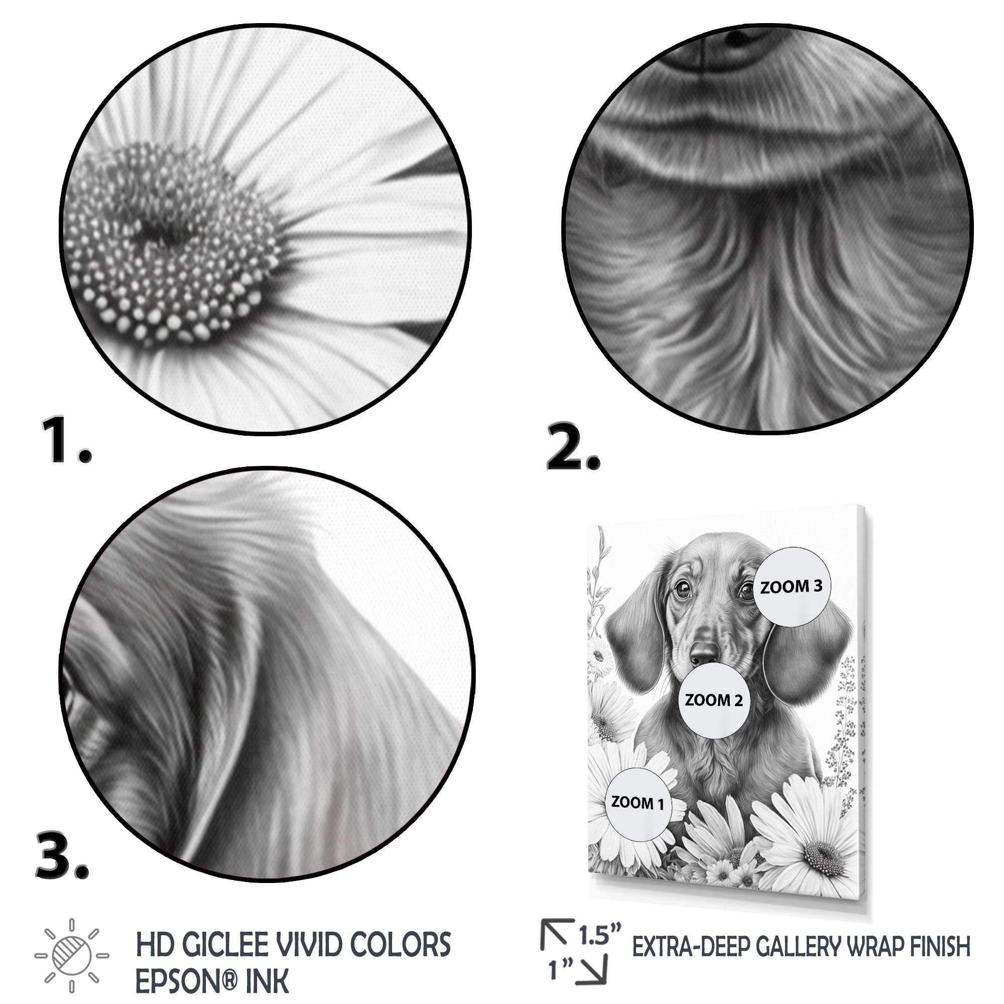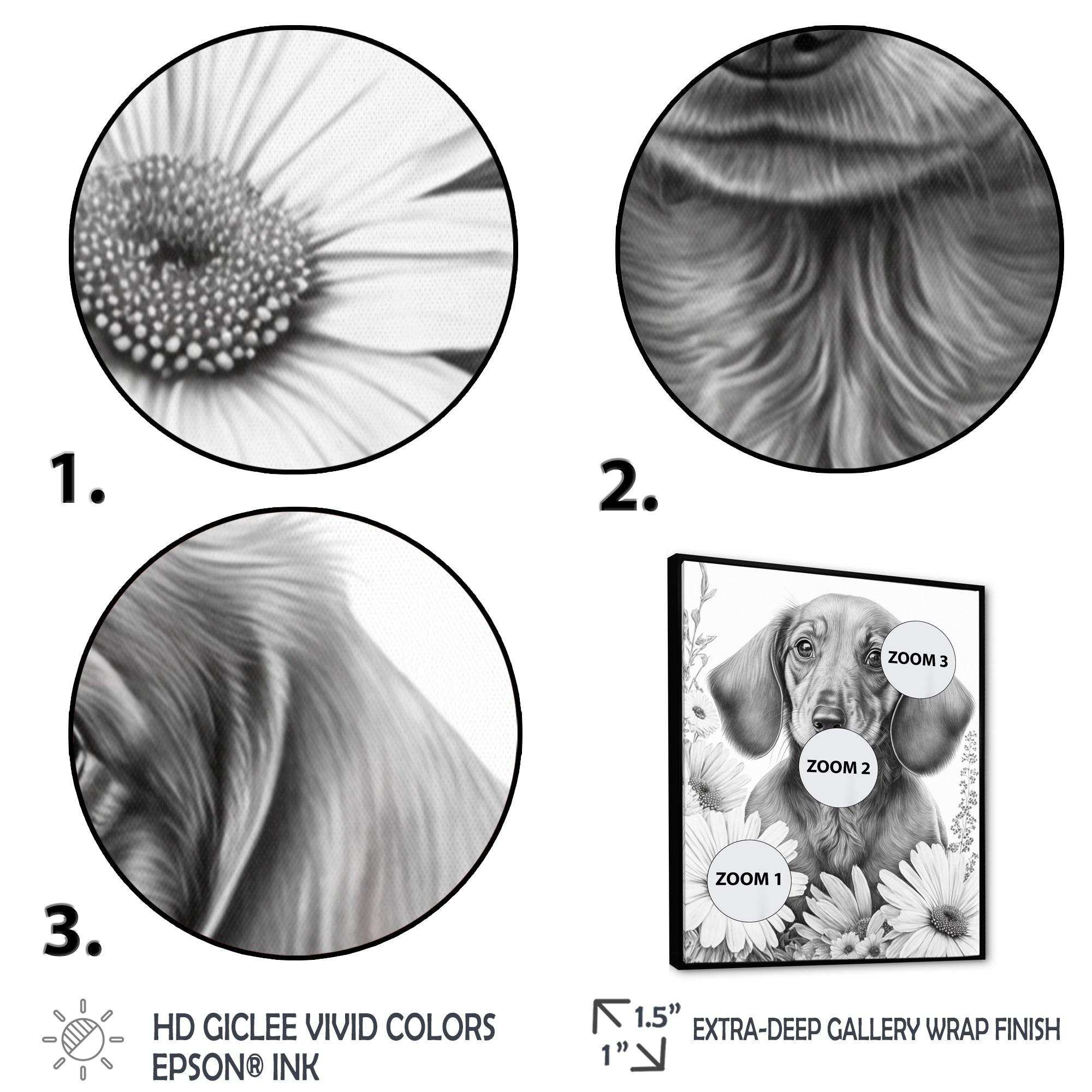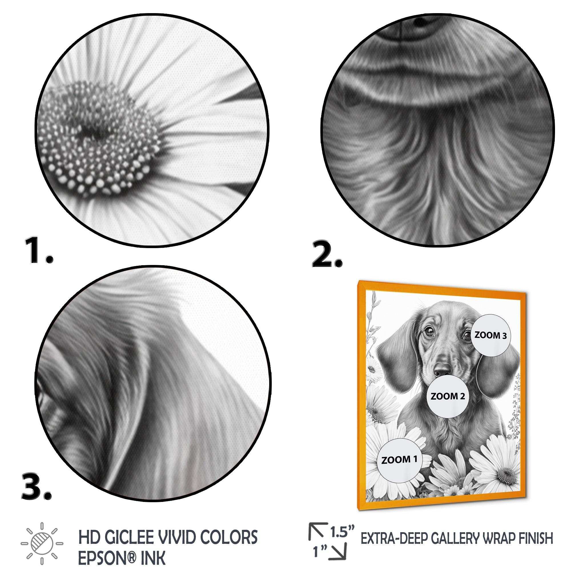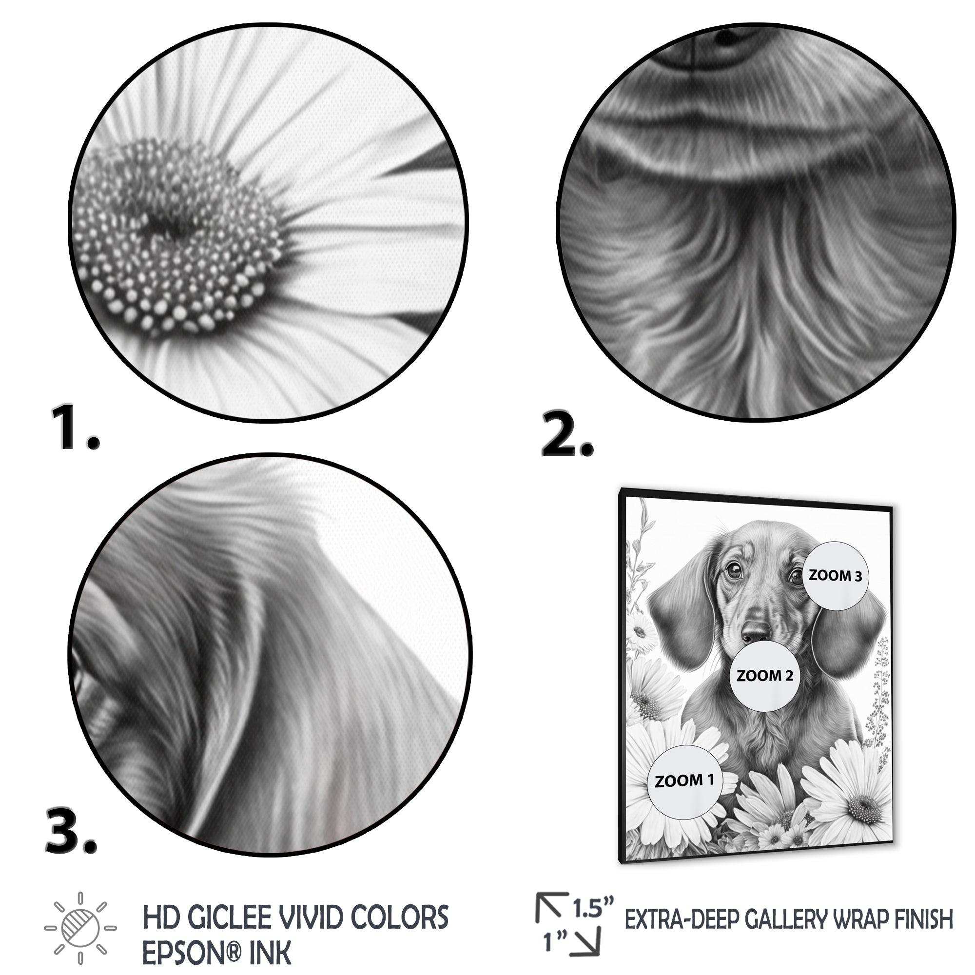 This beautiful Black Dachshund With White Flowers I Canvas Art is printed using the highest quality fade-resistant ink on canvas. Every one of our fine art giclee canvas prints is printed on premium quality cotton canvas, using the finest quality inks which will not fade over time. Each giclee print...