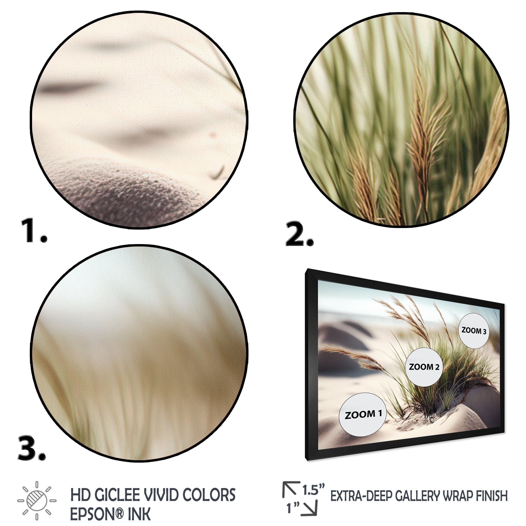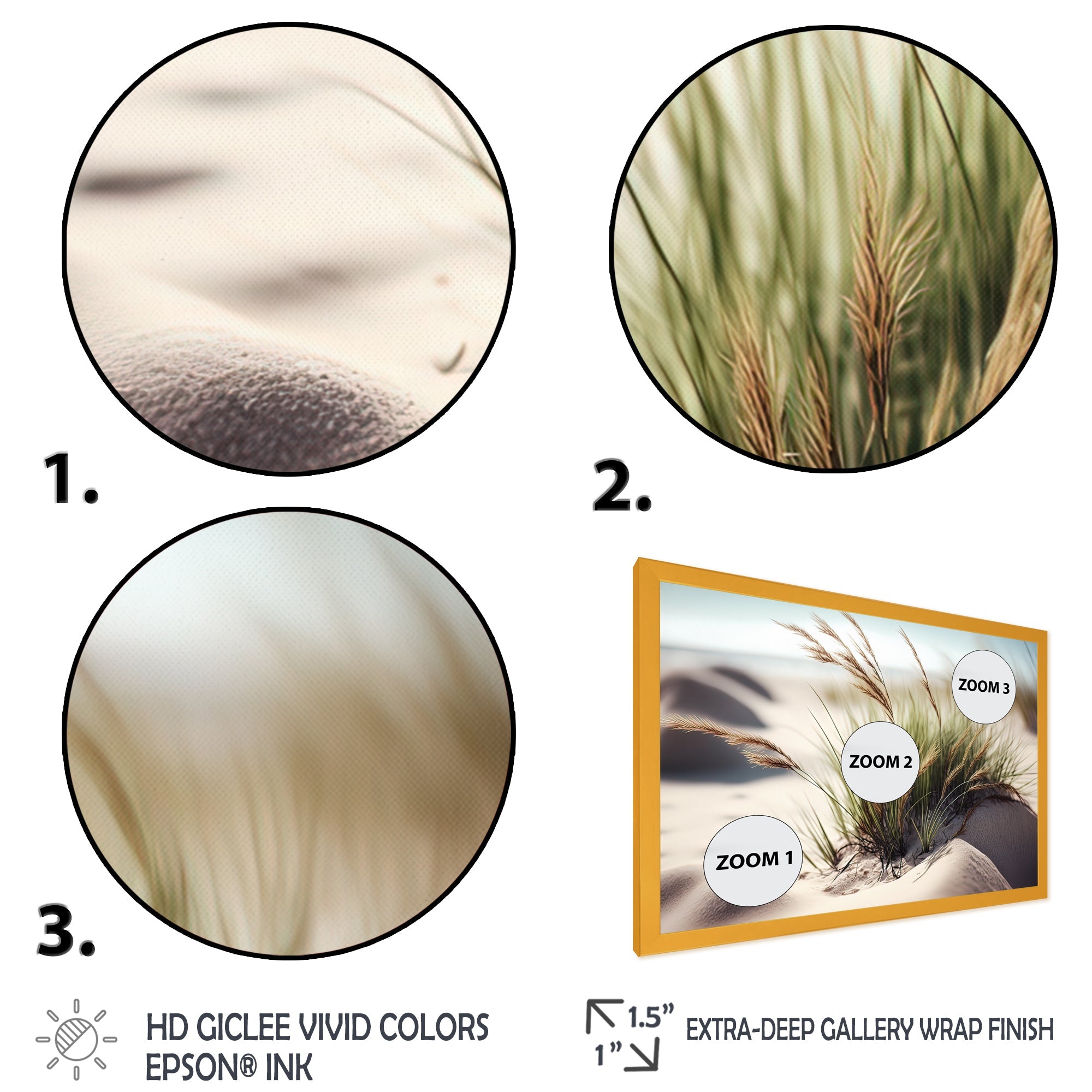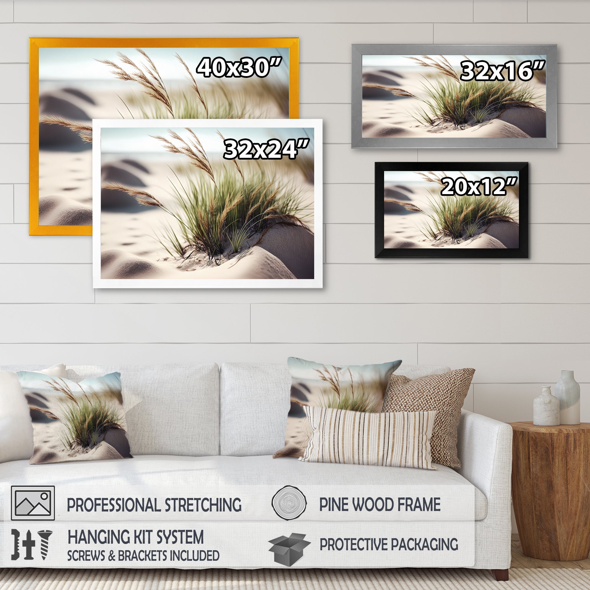 This beautiful Grass On Sand Dunes II Canvas Art is printed using the highest quality fade-resistant ink on canvas. Every one of our fine art giclee canvas prints is printed on premium quality cotton canvas, using the finest quality inks which will not fade over time. Each giclee print is stretched tightly over a 1-inch wood sub frame for small size prints or a 1.5-inch wood subframe for large size prints ensuring the canvas is taught and does not buckle. This canvas art print is gallery-wrapped (the design continues on the sides), giving it a real art gallery feel. All of our canvas prints are carefully packaged with plastic protection, fragile labeling, and sturdy boxes to ensure safe delivery. Every canvas print arrives ready to hang on the wall, with the hanging kits included.
