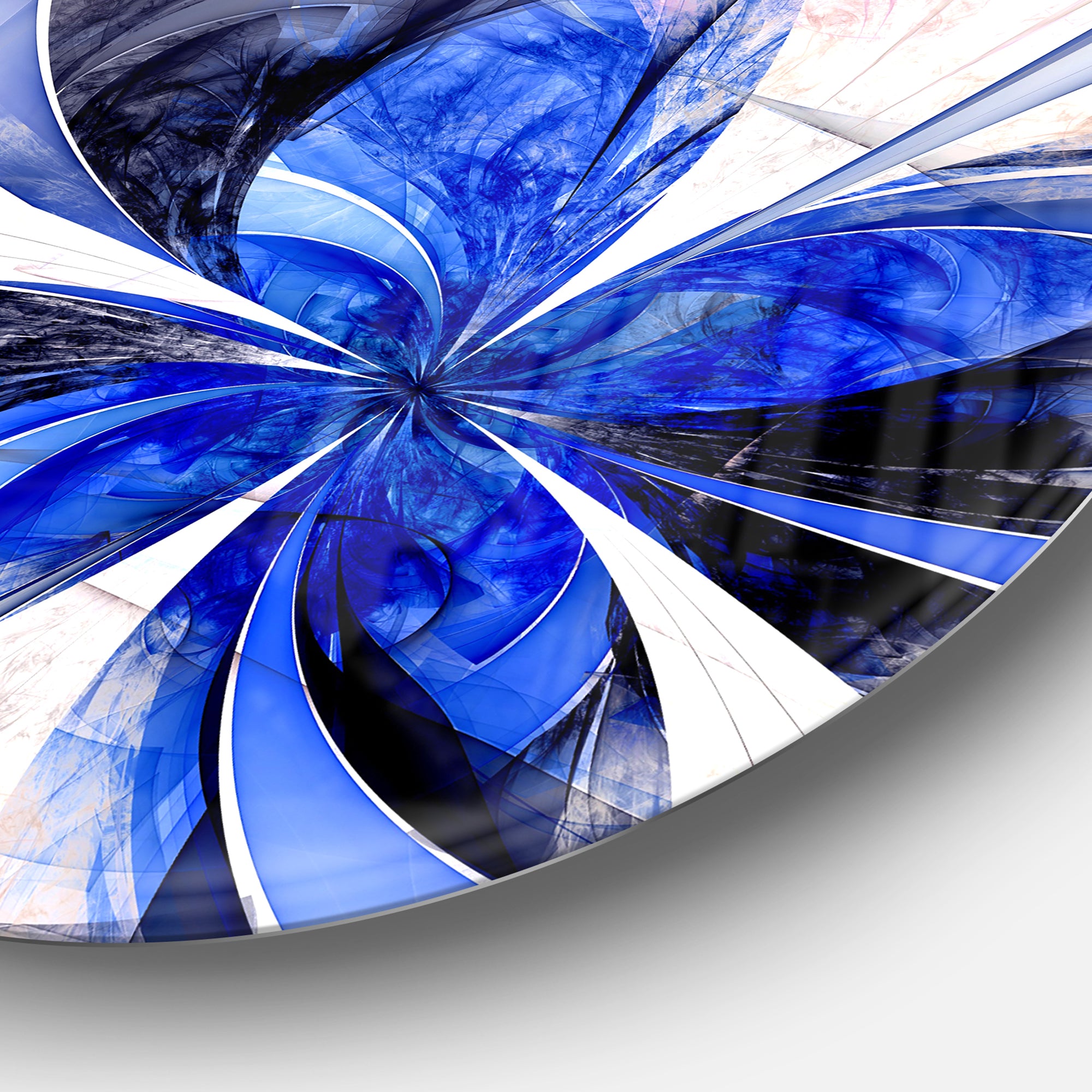 Bring Contemporary Abstraction to your home with this Black Circle metal wall art. Available in several size, this Symmetrical Bright Blue Fractal Flower Metal Artwork makes it the focal point of any room or office.