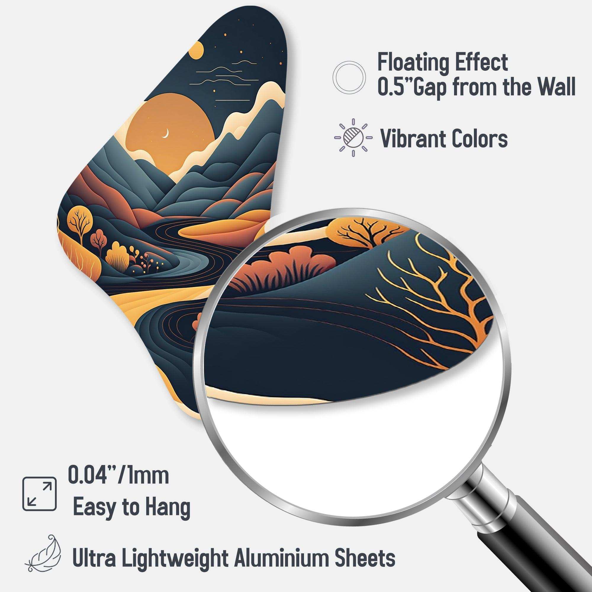 Orange Moon In Graphic Blue River Mountains - Asymmetric Metal Wall Art
