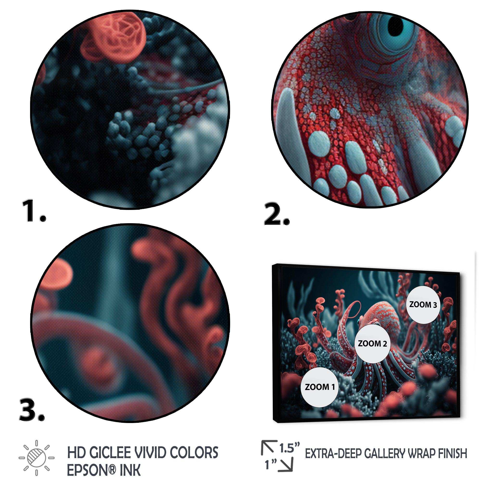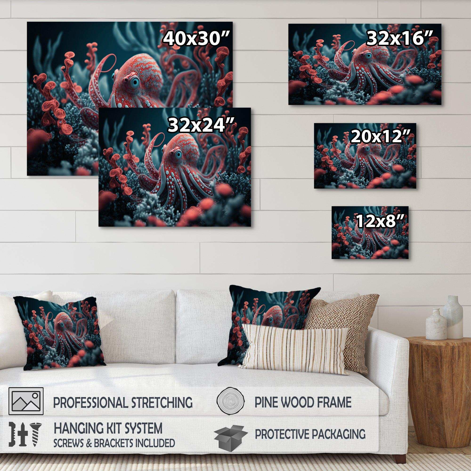 This beautiful Red Octopus On The Ocean Floor I Canvas Art is printed using the highest quality fade-resistant ink on canvas. Every one of our fine art giclee canvas prints is printed on premium quality cotton canvas, using the finest quality inks which will not fade over time. Each giclee print is stretched tightly over a 1-inch wood sub frame for small size prints or a 1.5-inch wood subframe for large size prints ensuring the canvas is taught and does not buckle. This canvas art print is gallery-wrapped (the design continues on the sides), giving it a real art gallery feel. All of our canvas prints are carefully packaged with plastic protection, fragile labeling, and sturdy boxes to ensure safe delivery. Every canvas print arrives ready to hang on the wall, with the hanging kits included.