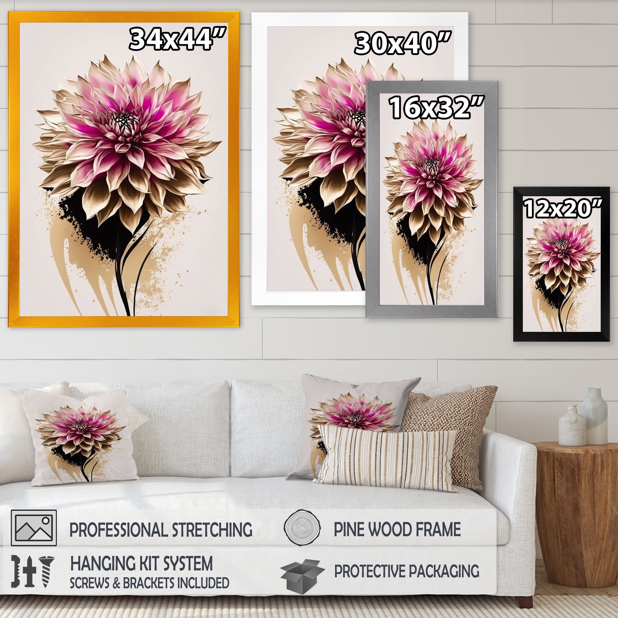 This beautiful Pink Dahli Flower On Abstract Fusion Canvas Art is printed using the highest quality fade-resistant ink on canvas. Every one of our fine art giclee canvas prints is printed on premium quality cotton canvas, using the finest quality inks which will not fade over time. Each giclee print is stretched tightly over a 1-inch wood sub frame for small size prints or a 1.5-inch wood subframe for large size prints ensuring the canvas is taught and does not buckle. This canvas art print is gallery-wrapped (the design continues on the sides), giving it a real art gallery feel. All of our canvas prints are carefully packaged with plastic protection, fragile labeling, and sturdy boxes to ensure safe delivery. Every canvas print arrives ready to hang on the wall, with the hanging kits included.